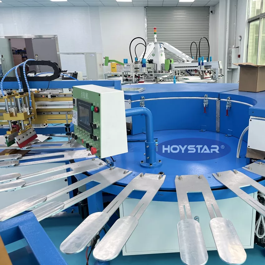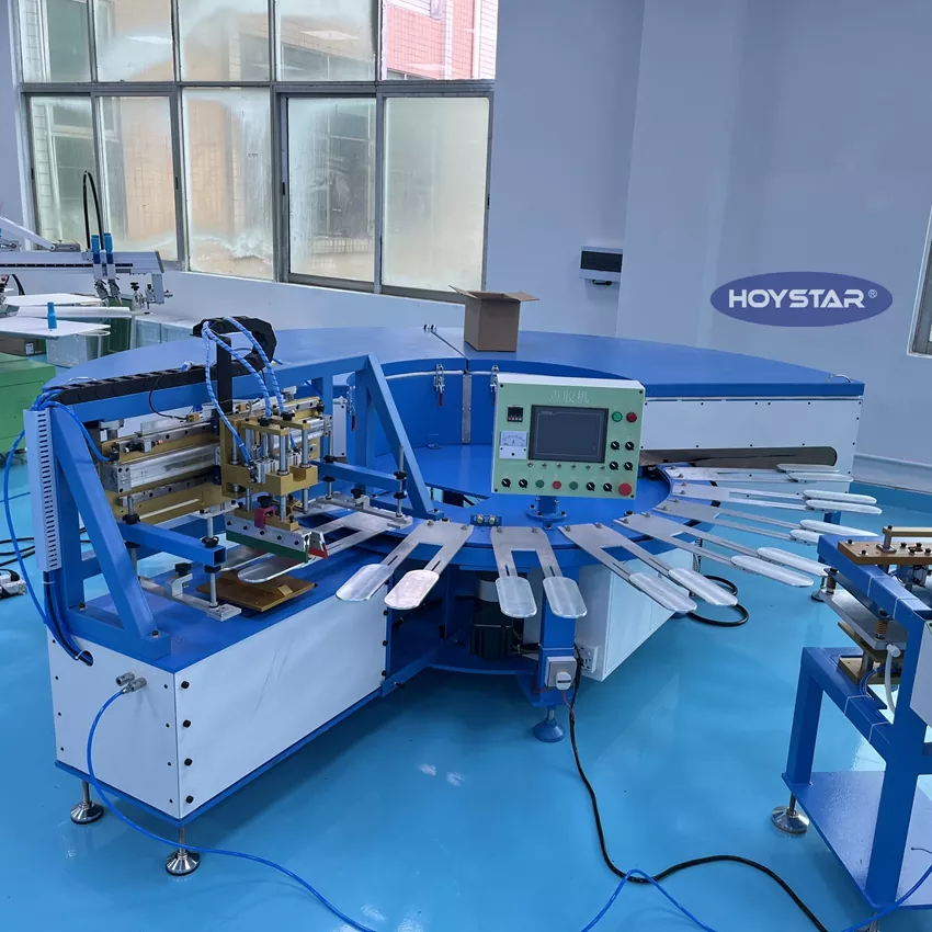 HOYSTAR ialah pengilang dan pembekal yang boleh dipercayai di China; Mesin Cetak Skrin Stoking Anti-slip Tinggi HOYSTAR ini direka untuk aplikasi dalam industri mengait tekstil. Dengan kelajuan sehingga 800-1000pairs/Jam, ia sesuai untuk mencetak stokin tidak licin, stokin bayi, stokin dewasa, stokin bola sepak, dll. Dilengkapi dengan meja kerja berputar, ia sangat mudah untuk memuatkan dan memunggah stoking. Kawalan skrin sentuh PLC, sangat mudah dikendalikan. Mesin yang dilengkapi dengan sistem pengeringan boleh mengeringkan silikon dan dakwat dengan baik.