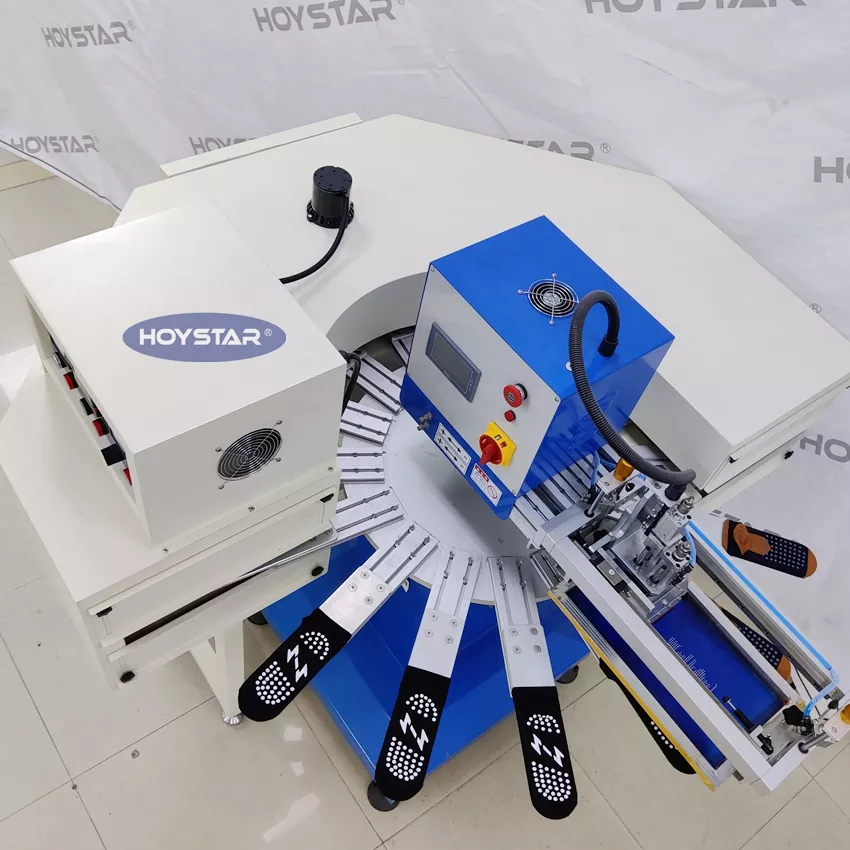 Sebagai pengilang dan pembekal profesional, Mesin Cetak Skrin Sutera Stoking Tinggi Pantas Tinggi HOYSTAR ini direka untuk aplikasi dalam industri mengait tekstil. Dengan kelajuan sehingga 1200PCS/Jam, ia sesuai untuk mencetak stokin tidak licin, stokin bayi, stoking dewasa, stokin bola sepak, dll. Dilengkapi dengan meja kerja berputar dan 16 stesen kerja, ia sangat mudah untuk memuatkan dan memunggah stoking. Kawalan skrin sentuh PLC, sangat mudah dikendalikan. Mesin yang dilengkapi dengan sistem pengeringan boleh mengeringkan silikon dan dakwat dengan baik.