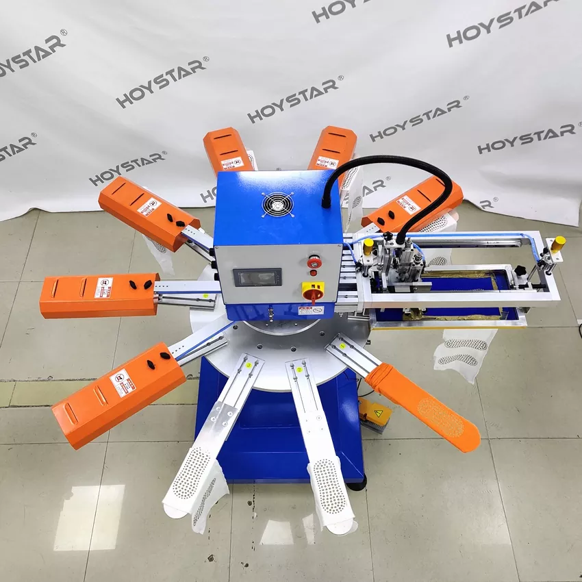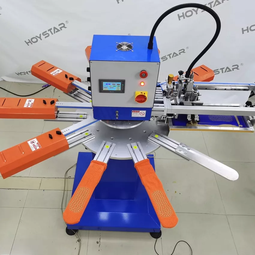 Sebagai pengilang dan pembekal profesional, Mesin Cetak Skrin Pantas Tinggi HOYSTAR untuk Stokin direka untuk aplikasi dalam industri mengait tekstil. Dengan kelajuan sehingga 1000PCS/Jam, ia sesuai untuk mencetak stokin tidak licin, stokin bayi, stoking dewasa, stokin bola sepak, dll. Dilengkapi dengan meja kerja berputar, ia sangat mudah untuk memuatkan dan memunggah stoking. Kawalan skrin sentuh PLC, sangat mudah dikendalikan. Mesin yang dilengkapi dengan sistem pengeringan boleh mengeringkan silikon dan dakwat dengan baik.